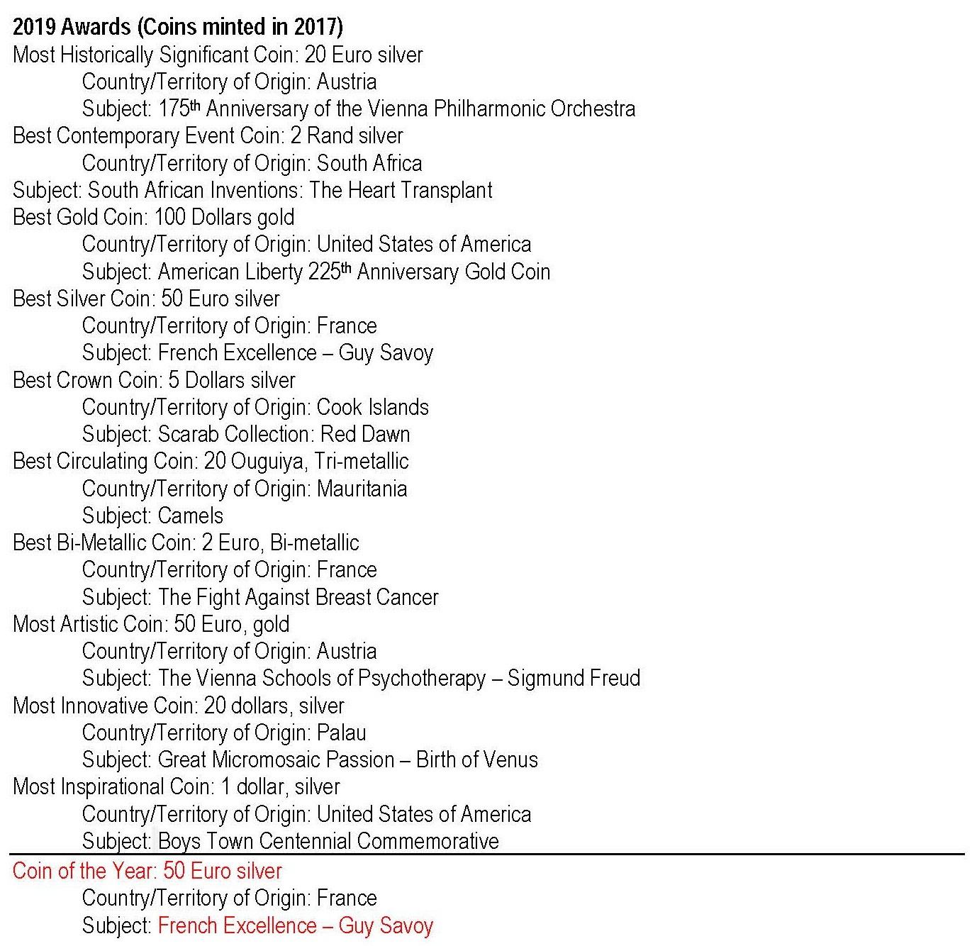 Câştigătorul Coin of the Year este marcat în dreptunghi colorat. Excepţie anul 2016, când NU s-a acordat titlul pentru o monedă ci pentru întreaga activitate.