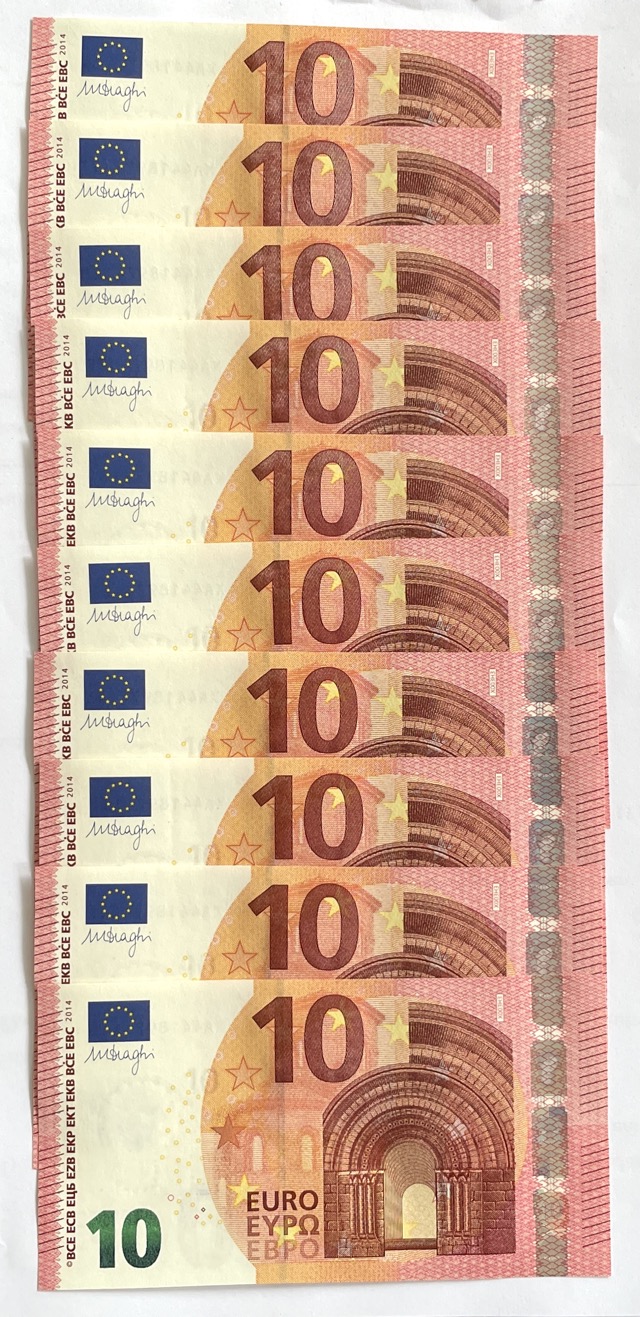 Vand zece bancnote de 10 € necirculate cu numere de serie ‚consecutive‘, incrementul fiind 9, vezi foto.