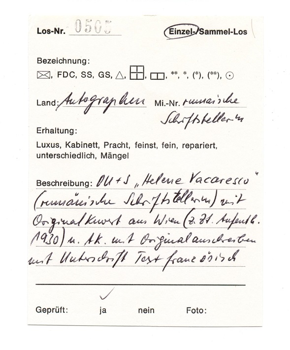 Ilustrata sctrisa si semnata de Elena Vacarescu, cu bonul cu numarul piesei in licitatie, EUR 155,- cu recomandata inclusa.