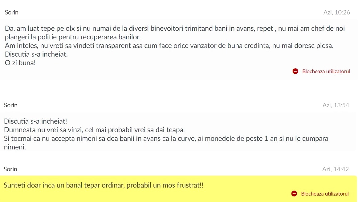 Domnul Sorin, de la Suceava, de pe OLX, s-a suparat rau de tot. I-am refuzat livrarea unei monede cu verificarea coletului. M-a facut in tot felu".