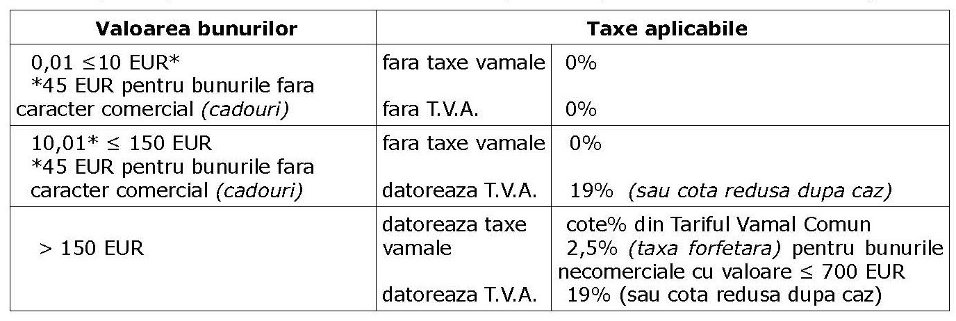 - bunurile primite ca urmare a unei comenzi efectuată prin internet, prin corespondenţă, telefon sau telechat sunt cu regimul din următorul tabel: - atenţie: taxa forfetară de 2,5% nu se aplică pentru bunurile primite prin colet ca urmare a unei comenzi efectuată prin internet, corespondenţă, telefon sau telechat (taxele vamale sunt cotele procentuale cuprinse în Tariful Vamal Comun de Import al Uniunii Europene Versiune 2017 3): ori una ori alta, după caz