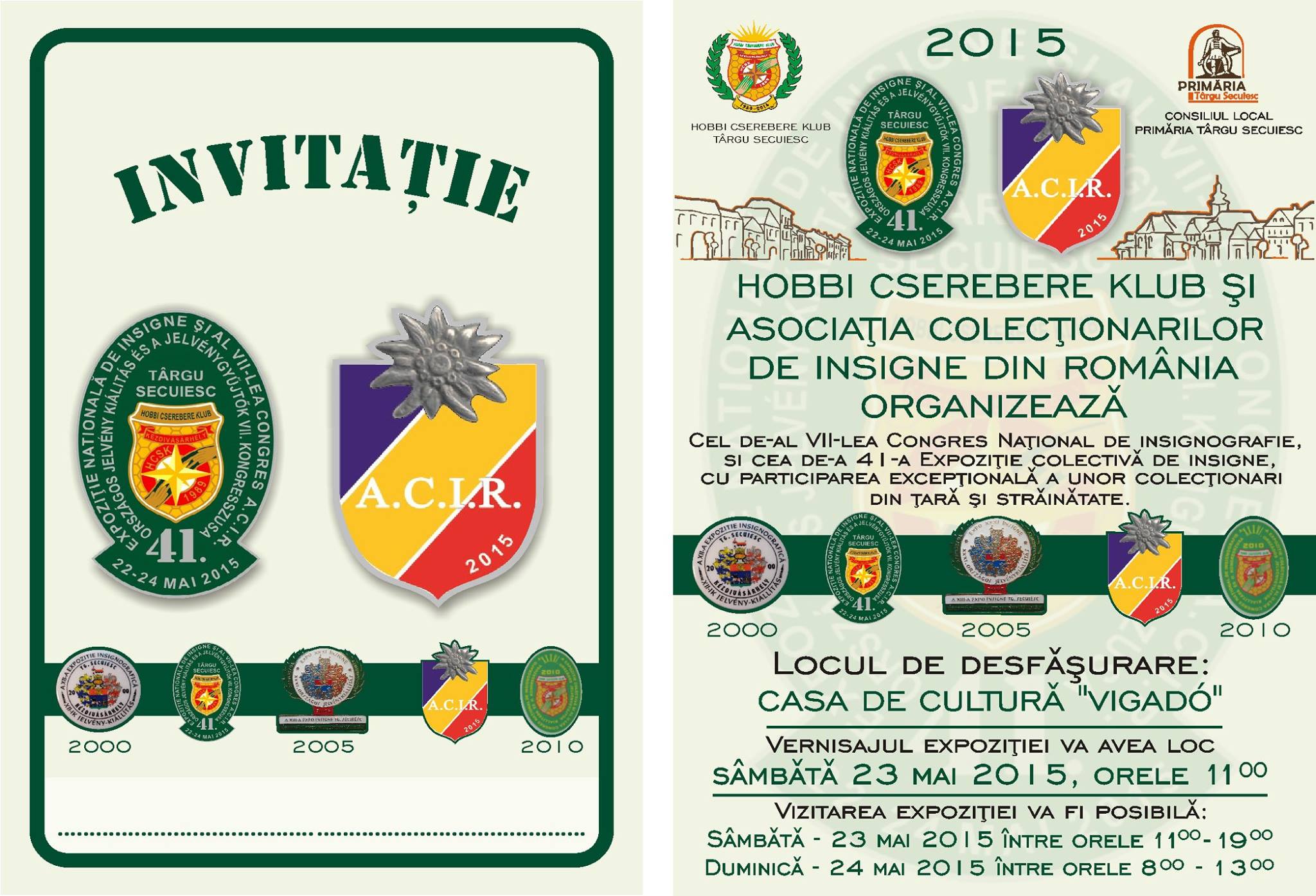 In intervalul 22 - 24 mai 2015 Municipiul Tg. Secuiesc va găzdui cel de-al VII-lea Congres Naţional de Insignografie şi a 41-a Expoziţie colectivă de insigne, manifestare organizata de Hobbi Cserebere Klub, cu sprijinul Consiliului Local şi al Primăriei Tg. Secuiesc.