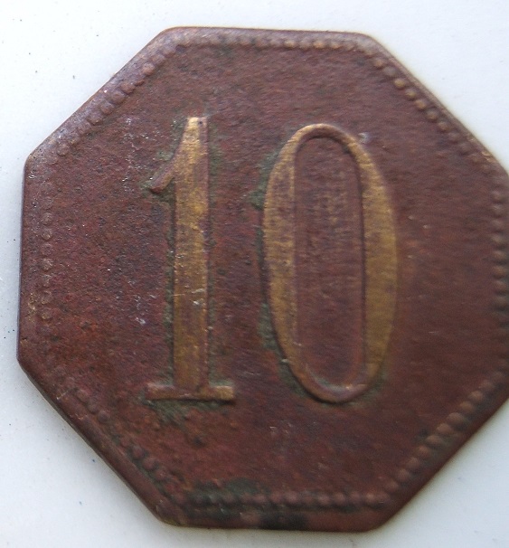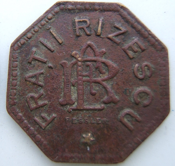 cel mai probabil jeton fie de cantină fie pentru achiziționarea de produse al firmei ”Frații Rizescu” SAn din București; fabrica (țesătorie mecanică de in și lână) era localizată în Brănești, Dâmbovița. A funcționat din 1937 până probabil în 1947 (naționalizare). Fabrica a fost înființată undeva pe la 1885 (căutați pe wiki comuna Brănești Dâmbovița)