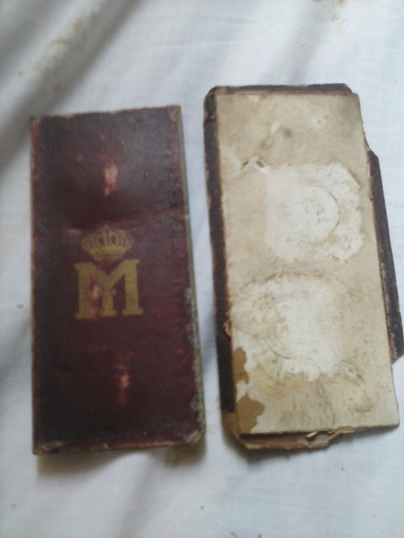 dupa cum arata pozele,aceste piese nu se afla intr-o stare f buna de conservare!la crucea serviciul credincios 1938 cu spade,de razboi,un pret pentru una in stare perfecta este cam de 250 de lei,dar cele prezentate nu sunt in stare perfecta,asa ca eu spun ca fac cam 150-200 de lei pe bucata!iar virtutea militara,in stare perfecta,cu pamblica face cam 400 de lei[poate si mai mult,depinde de model]acestea,avand in vedere ca nu au pamblica,si starea lasa putin de dorit fac intre 230 si 280 de lei!semnul onorific rasplata muncii pentru 25 de ani in serviciul statului,face in stare perfecta cam 280 de lei,acesta nu este in stare perfecta,asa ca face undeva intre 200 si 250 de lei!cutiile acelea pentru decoratii,avand in vedere starea actuala fac cam 10 lei buucata!daca am gresit cu ceva,astept corectari!aceste preturi sunt doar informative,ca sa va faceti o parere!