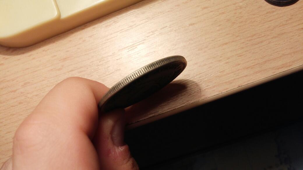 S-a rezolvat misterul. "Moneda" se numeste "moneda magicianului" si este exact ceea ce se vede in poze: doua monede diferite taiate si apoi lipite (?) una de alta. Taietura se poate observa cica pe muchie, dar eu sincer nu o vad.