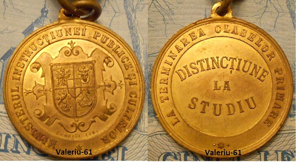 "Medalie şcolară. — Avers: Marca României ornamentată cu inscripţie formând cerc: MINISTERUL INSTRUCŢIUNII PUBLICE SI AL CULTELOR. oOm/'m cu toartă de alamă (Carniol gr,). Revers: Pe trei rânduri prima şi ultima în semicerc DISTINCTIUNE LA STUDIU cu inscripţie circulară LA TERMINAREA CLASELOR PRIMARE *"