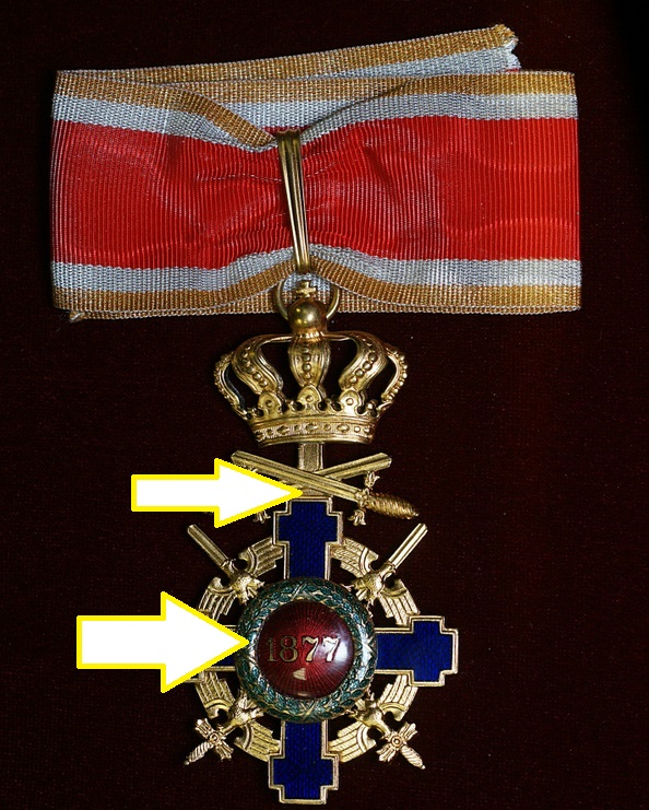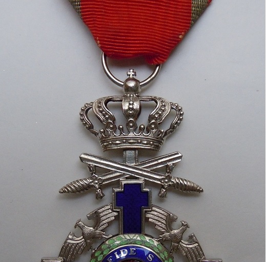Ordinul se putea conferi cu spade duble cand militarul respectiv primise deja crucea pt. merite pe timp de pace si urma sa primeasca alta pt. merite de razboi.