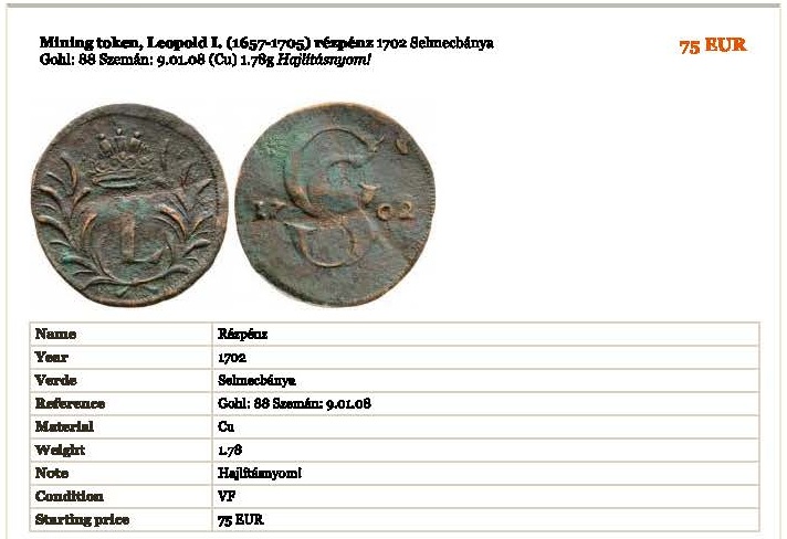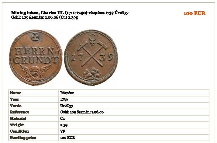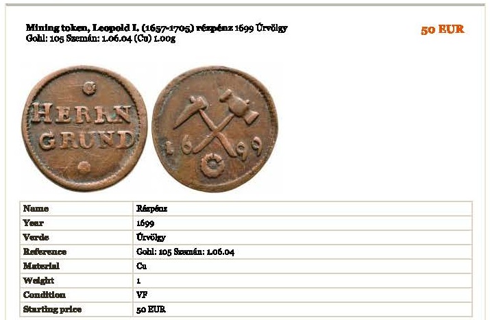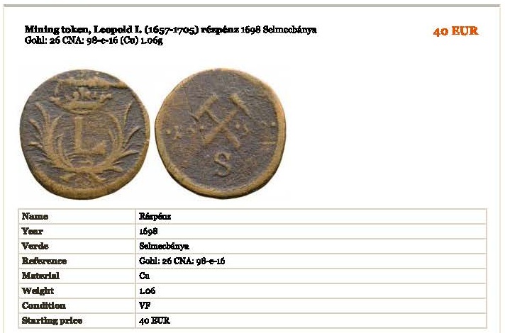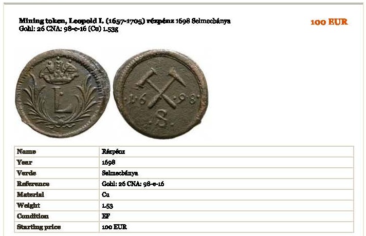 Este un token / jeton emis pentru mină, Rudolf (1576-1608). Pentru evaluare se poate lua de referinţă piesa de mai jos, preţul de pornire şi starea acesteia (este cotată RR, starea mai bună ca în solicitarea de identificare). Nu cunosc cu cât s-a finalizat. Lotul din care face parte este impresionant, aşa că îl detaliez în continuarea acestui răspuns.