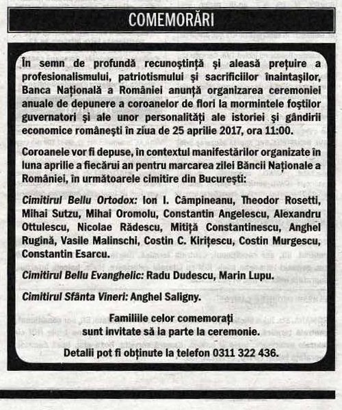 Am dat telefon la numărul din ferpar şi am două preciyări de făcut (probabil că mai sunt şi alţii ca mine care nu cunosc aceste detalii):popoviciliza scrie:La data de 22 aprilie 2017, BNR are o singură comunicare aproape de temă (culeasă din România liberă, 21 aprilie 2017). Este o comemorare, nu o aniversare.