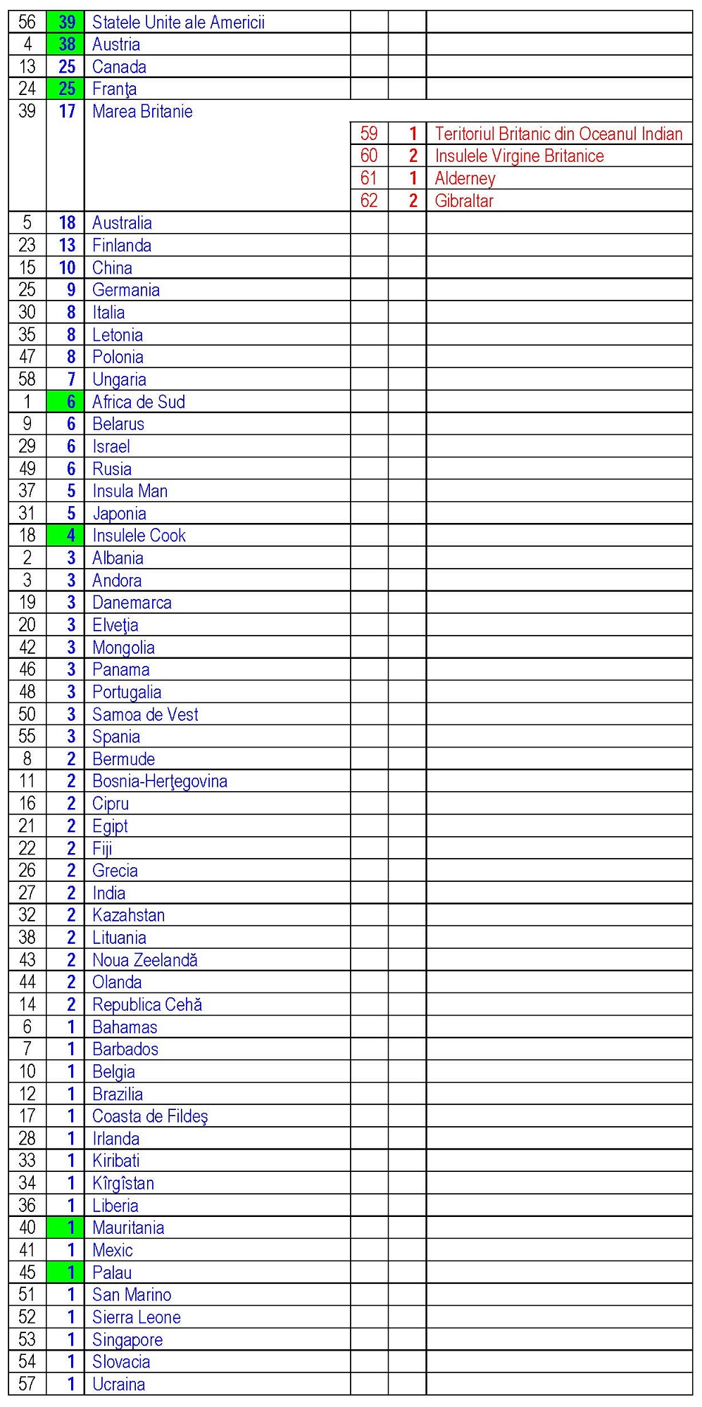 Primul clasament este cel cu toate ţările / teritoriile luate separat. - astfel, avem: