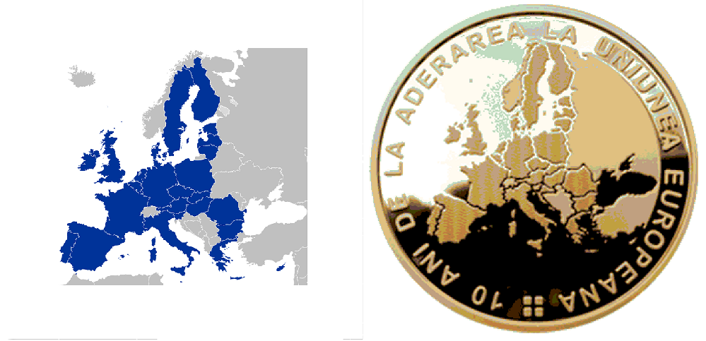 Diferenţa între cele două hărţi este că din 2007 (EU27) şi până în 2017 (EU28) în Uniunea Europeană a mai intrat Croaţia (2013), iar harta de pe moneda aprobată de către BNR este de tipul celei de mai jos: