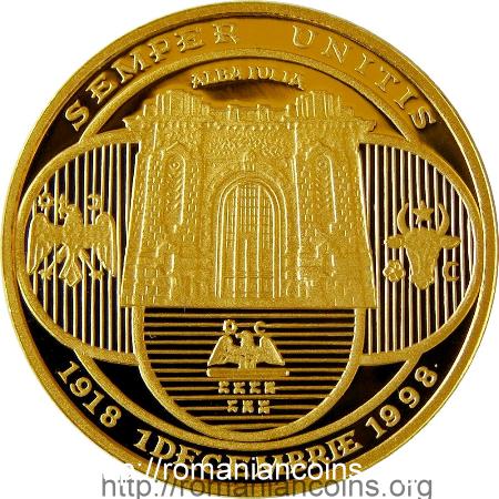 Sala Unirii din Alba Iulia... este un caz special, în acelaşi timp reprezintă numai o parte din simbolistica Marii Uniri (chiar şi în ce priveşte Unirea Transilvaniei cu România) şi mai mult decât acest eveniment (încoronarea Regelui Ferdinand I și a Reginei Maria din 1922)... şi tocmai de aceea apare gafa 1000 de lei 1998 (80 de ani de la Unire), pentru că obiectul presupus a fi simbolul Marii Uniri (copy/paste de pe fotografie pe modelul pentru monedă) este portalul realizat în 1922 pentru încoronare http://mirel-matyas.blogspot.ro/2016/12 ... -alba.html . Anecdotic, nici măcar imaginea interioară iniţială a acestei săli nu este la îndemâna „artistului”, cea mai veche fotografie părând a fi cea din 1929 (imaginea reflectând intervenţiile majore majore făcute pentru încoronare):