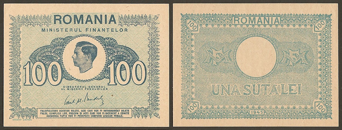 Revers | Verso: fond: alb-bleu-albastru nuanţe, desen linii ondulate şi granule mărunte, sistem Guillot; tipăritura: chenar cu figuri geometrice şi ornamentaţii întrerupt sus de inscripţia ROMANIA, în câmp un medalion rotund, flancat de monograma „MF” imprimată pe desen Guillot, sub medalion valoarea nominală UNA SUTĂ LEI, în chenar jos anul emisiunii 1945, iar în colţuri valoare 100 în poziţie oblică (Şerban Zainea)