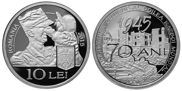 Revers: o compoziţie care ilustrează distrugerile provocate de cel de-al Doilea Război Mondial, inscripţiile „INCHEIEREA CELUI DE-AL DOILEA RAZBOI MONDIAL”, „70 ANI“ şi „1945” - anul terminării războiului”