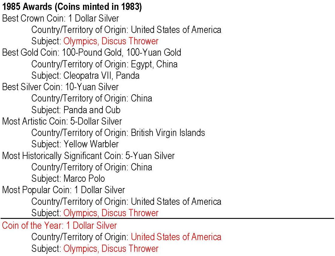 - anul 1985 cu monedele având nominal 1983; cu roşu: câştigătorul Coin of the Year -