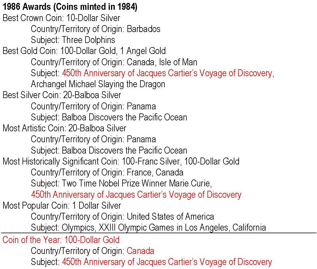 - anul 1986 cu monedele având nominal 1984; cu roşu: câştigătorul Coin of the Year -