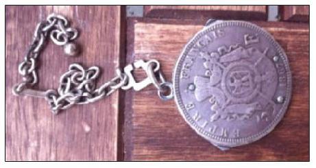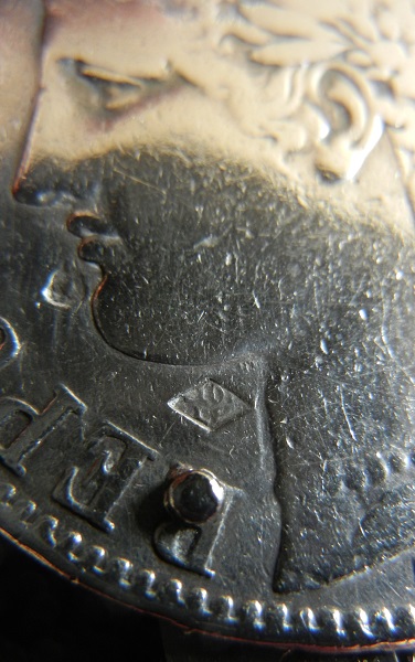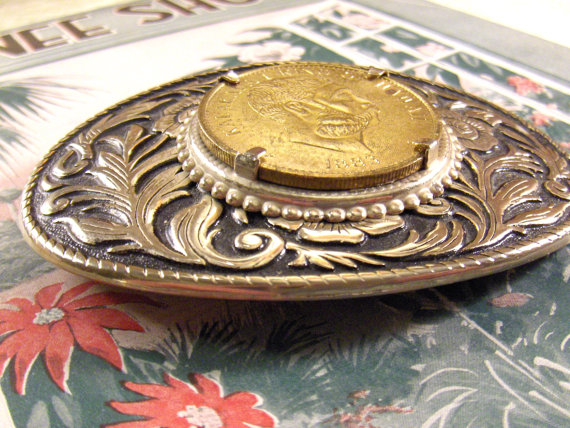 Este vorba despre o "pafta" cu totul ieşită din comun: o piesă de 1 dolar 1883 (Hawai) anturată de steme mici (Hawai, dar pe care nu le-am identificat ca provenienţă, cel puţin deocamdată).