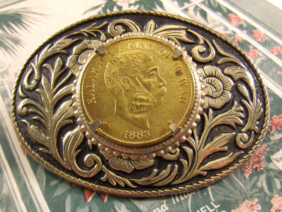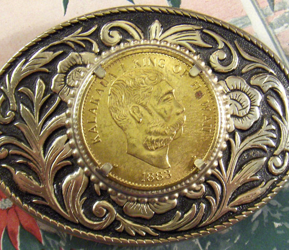Este descrisă "Belt Buckle King of Hawaii David Kalakaua Repo 1883 Gold Coin".