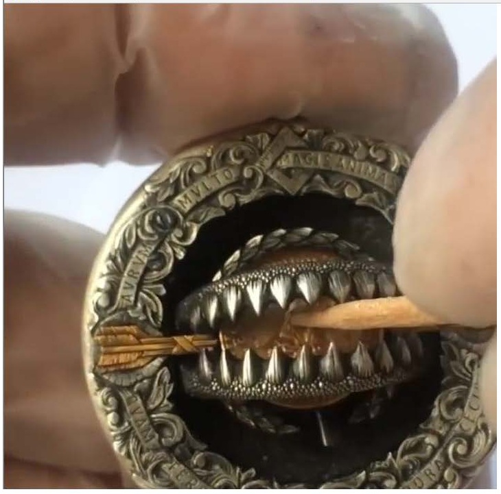 The trap jaws are triggered when the gold coin is pressed. The spring is too weak to do any actual harm to your fingers it’s just a decorative element. The inscription is the Latin phrase: “Aurum multo magis animas perdidit, quam ferrum corpora cecidit” which loosely translates to: “Gold has killed more souls than iron”