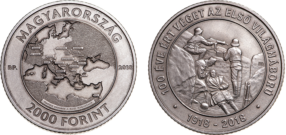 Aveți în link-ul de mai sus: „The obverse depicts a Eurocentric map of the world, with the most important World War I battles involving Hungary marked with stars or the outlined names of the locations. Opposing forces and neutral countries are distinguished with different surface finishes.”