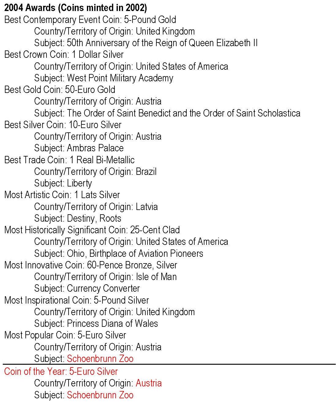 - anul 2004 cu monedele având nominal 2002; cu roşu: câştigătorul Coin of the Year -
