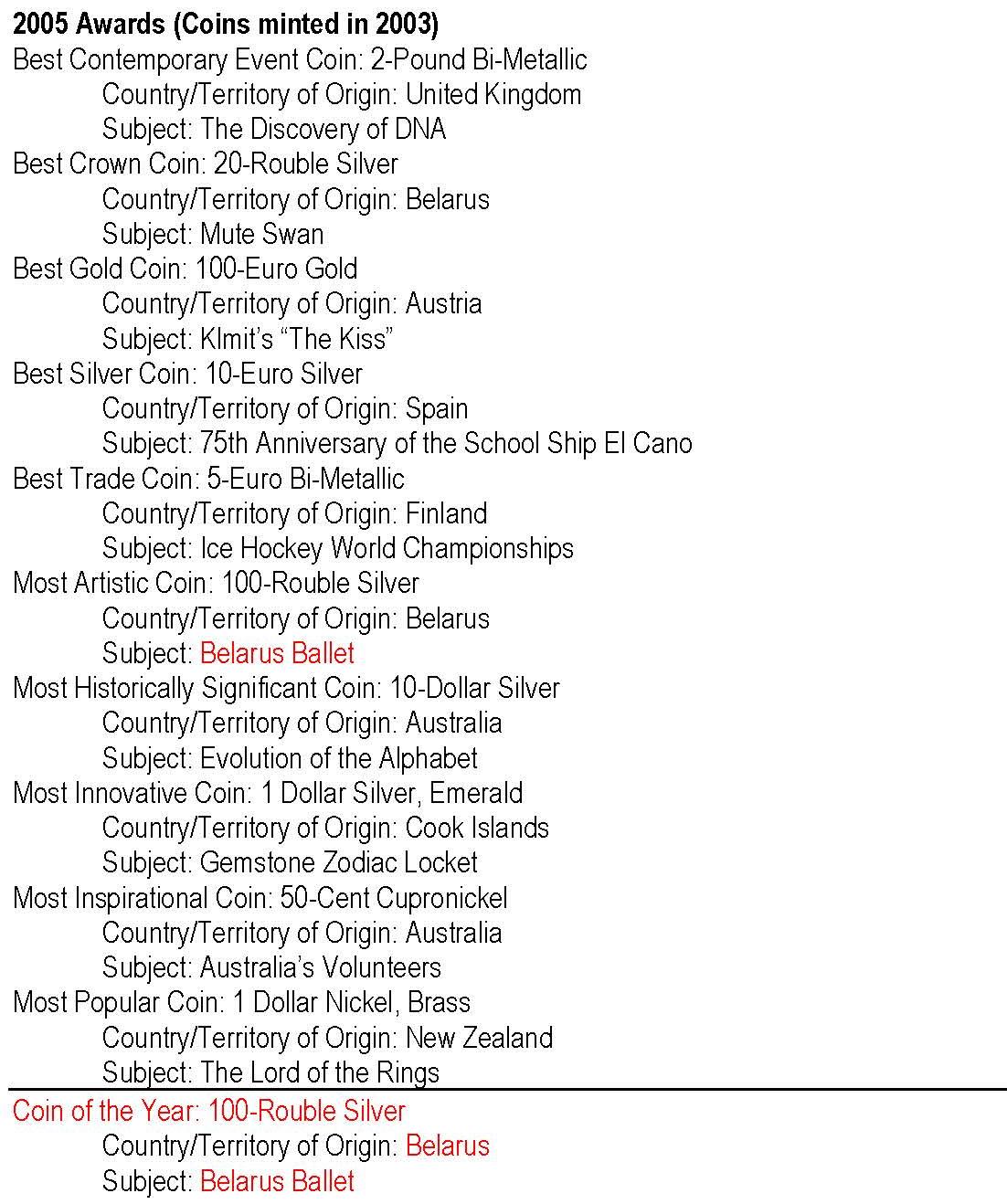 - anul 2005 cu monedele având nominal 2003; cu roşu: câştigătorul Coin of the Year -