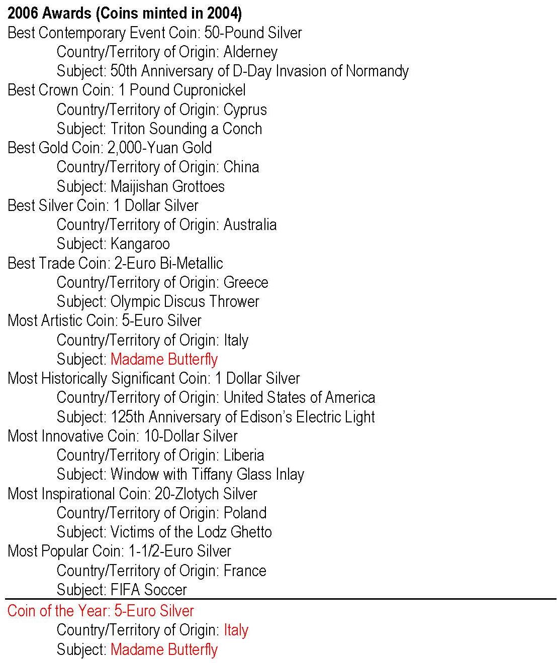 - anul 2006 cu monedele având nominal 2004; cu roşu: câştigătorul Coin of the Year -