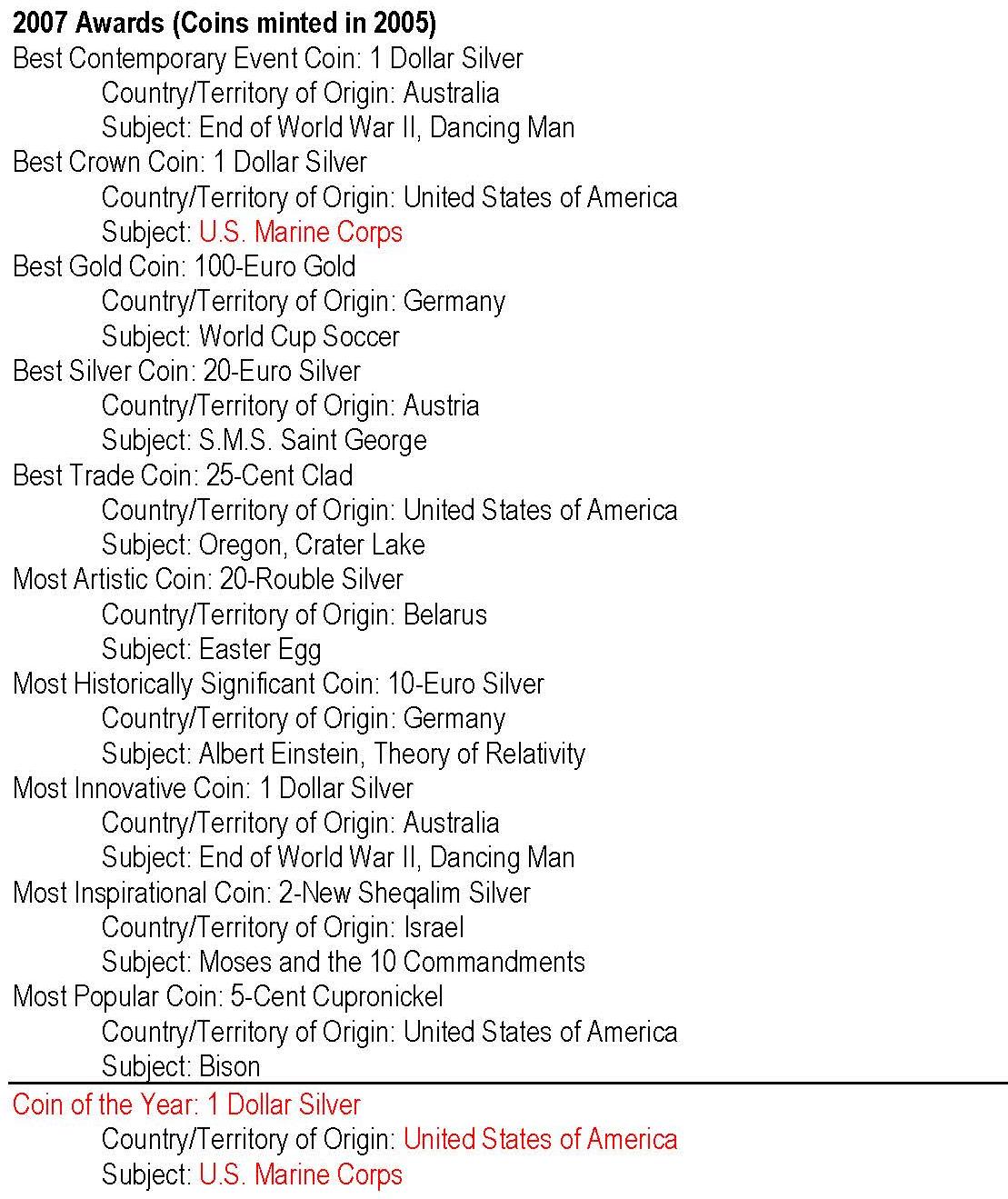 - anul 2007 cu monedele având nominal 2005; cu roşu: câştigătorul Coin of the Year -