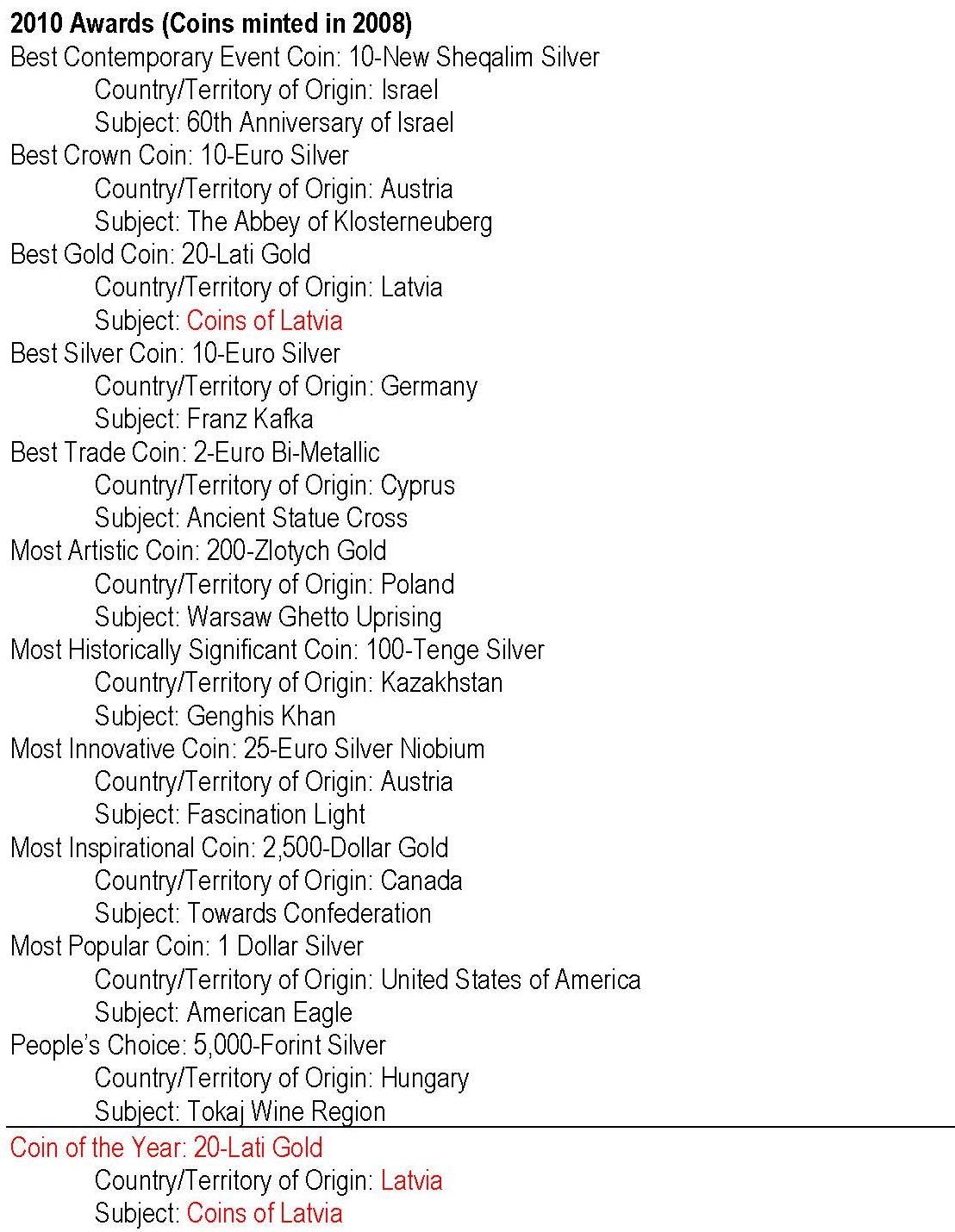 - anul 2010 cu monedele având nominal 2008; cu roşu: câştigătorul Coin of the Year -