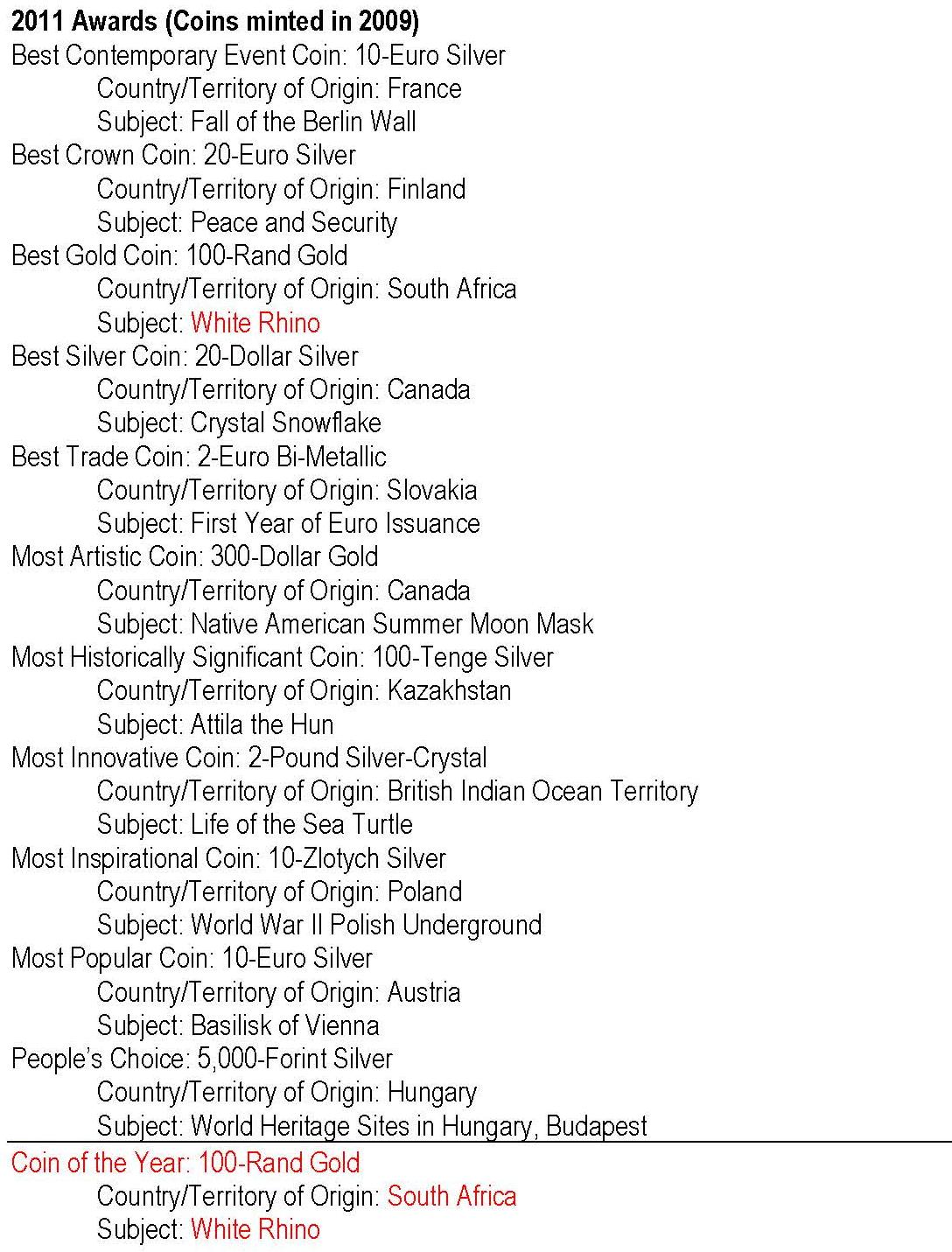 - anul 2011 cu monedele având nominal 2009; cu roşu: câştigătorul Coin of the Year -