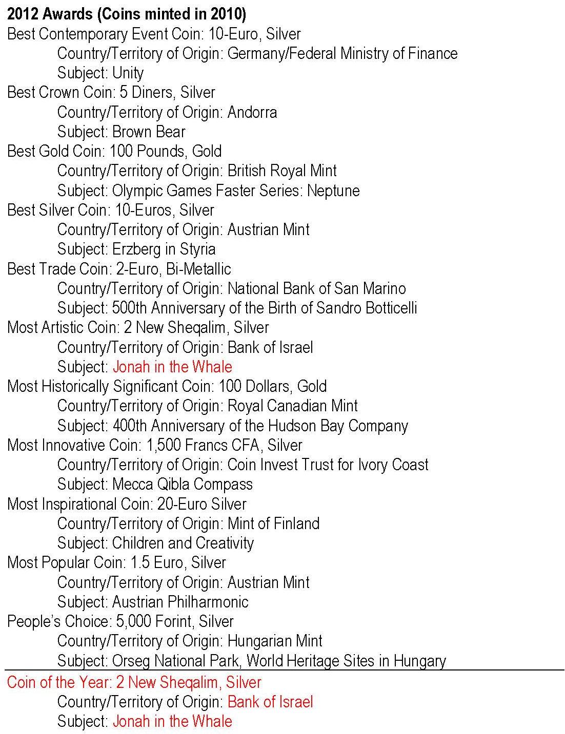 - anul 2012 cu monedele având nominal 2010; cu roşu: câştigătorul Coin of the Year -