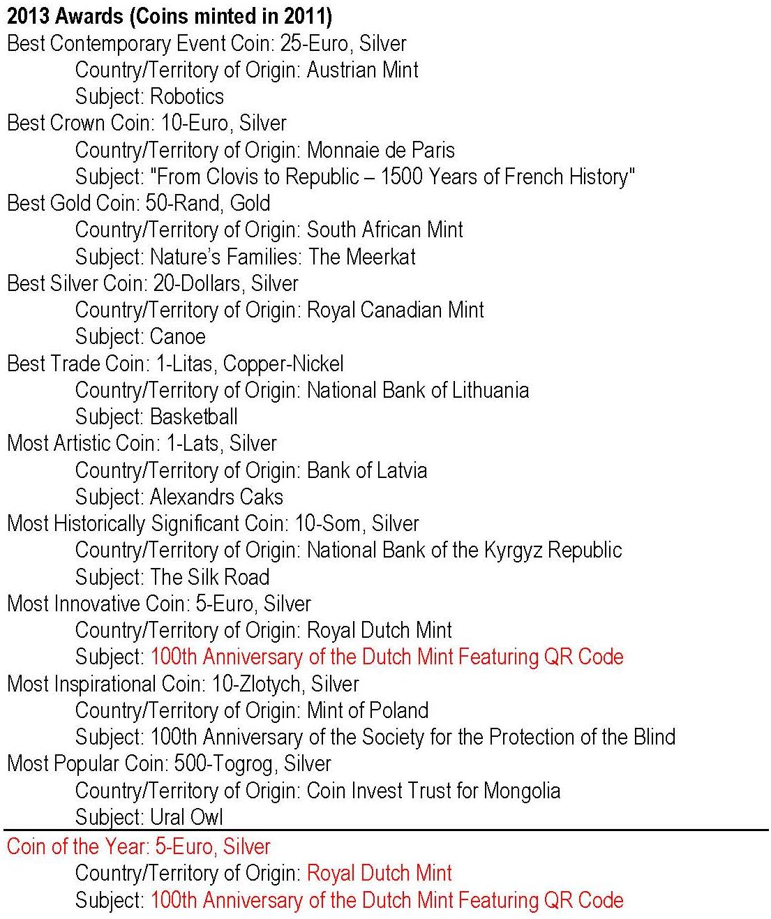 - anul 2013 cu monedele având nominal 2011; cu roşu: câştigătorul Coin of the Year -