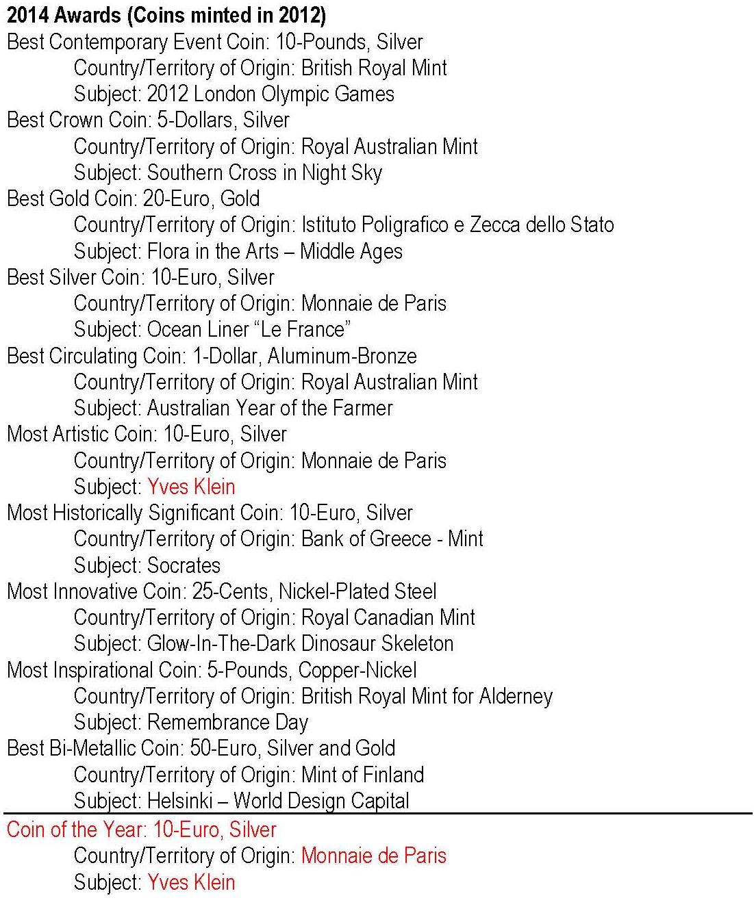 - anul 2014 cu monedele având nominal 2012; cu roşu: câştigătorul Coin of the Year -