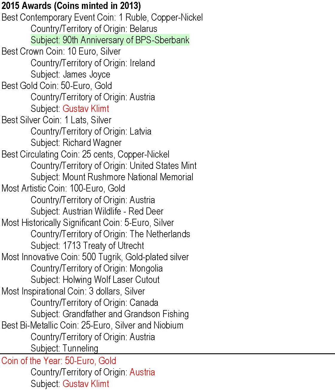 Dacă o monedă a fost premiată în 2 sau 3 categorii, atunci denumirea ţării care a emis-o este în roşu.