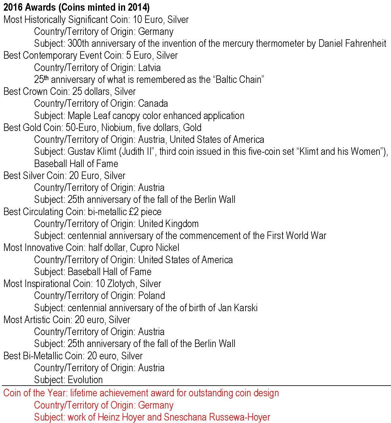 - anul 2016 cu monedele având nominal 2014; cu roşu: câştigătorul Coin of the Year: o premieră: pentru prima dată în 33 de ani s-a dat pentru întreaga activitate! -