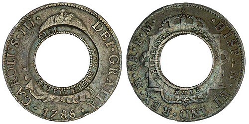 2. monedele "dump" + "holey dollar" create în 1813 în colonia New South Wales (acum în Australia)