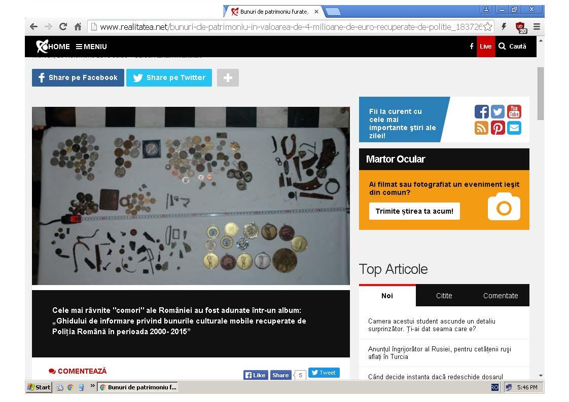 Azi, 25.11.2015, 10:30, la Hotel Hilton (...), Poliția Română - Direcția Investigații Criminale în parteneriat cu Fundația COLLEGIUM – XXI, "lansează în premiera un ghid în care se regăsesc toate bunurile de patrimoniu furate, care au fost recuperate. În ultimii 15 ani, politistii romani au găsit piese și opere de arta în valoare de 4 milioane de euro.