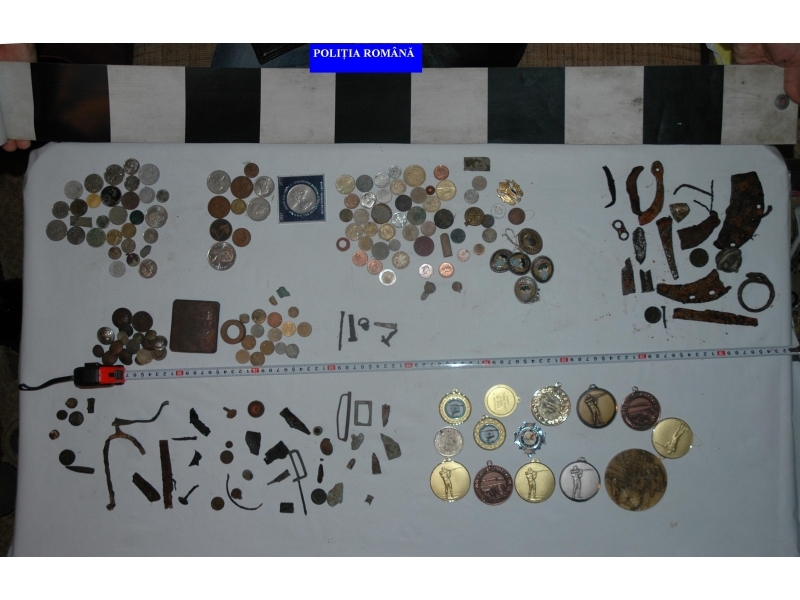 În urma percheziţiilor, poliţiştii au ridicat în vederea continuării cercetărilor 2.267 de monede arheologice, mai multe fragmente ceramice, vârfuri de suliţe din metal, un topor din bronz, un detector de metale, precum şi 6 unităţi de calculator, 1 laptop şi 3 tablete.