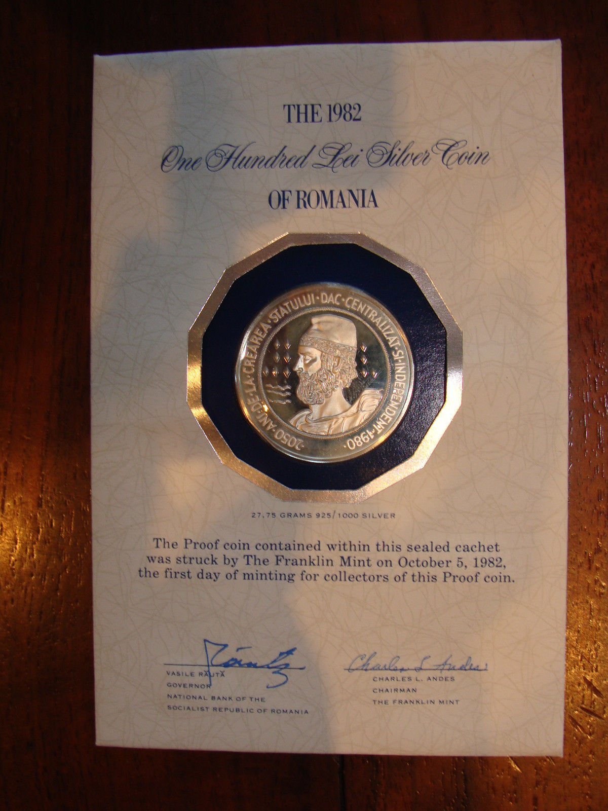 Absolut toate monedele de 100 lei 1982 vazute pe internet au greutatea mentionata pe certificat de 27.75 grame de "sterling silver", adica de argint cu puritatea de 925/1000. Greutatea de 30 grame, care este scrisa si la finalul catalogului Stambuliu (pagina 408), este evident eronata. Tind sa cred ca monetaria Franklin stia ce scrie pe certificate :D