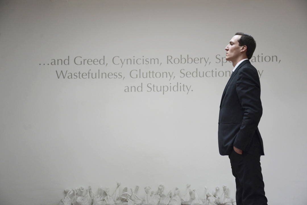 În jurul său pereţii erau decoraţi cu fraza: "Gentlemen, time has come to confess our Rudeness, Lust, Narcissism, Demagoguery, Falsehood, Banality, and Greed, Cynicism, Robbery, Speculation, Wastefulness, Gluttony, Seduction, Envy and Stupidity."