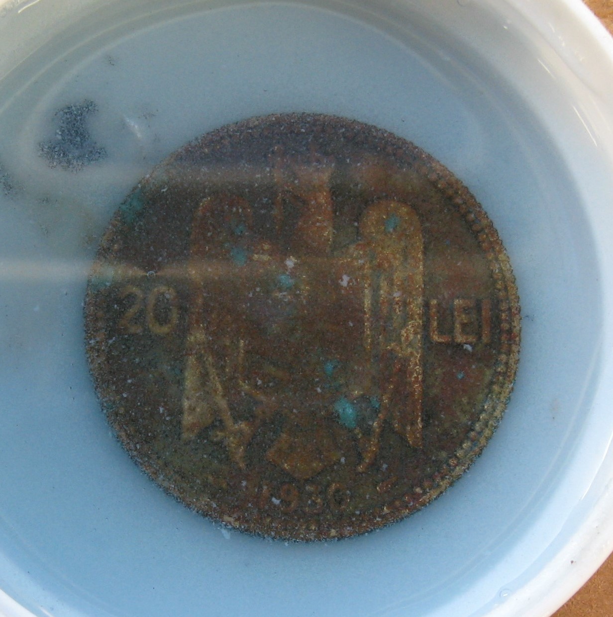 La aceste monezi singura optiune era curățare chimică . cinșpe minute respectiv trei minute lăsate în soluție foarte puternică , după care am folosit periajul cu periuța .