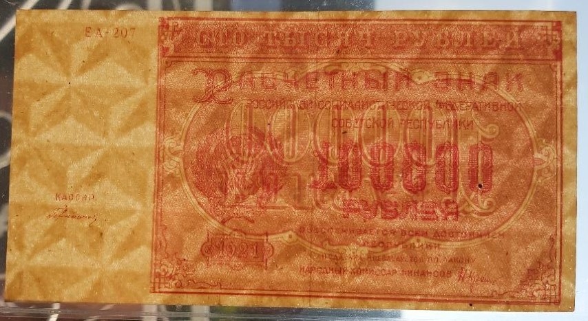 la bancnotele proprii din 1921 (50 ruble, 25.000 ruble, 50.000 ruble, 100.000 ruble) si la cele din Republicca Transcaucazia din 1923.