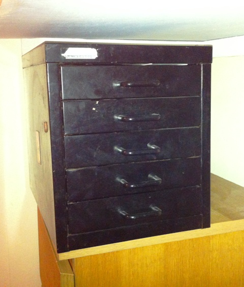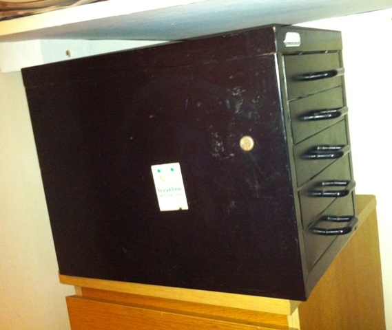 fisier metalic negru, tabla groasa, cinci sertare, dim aprox 25x35cm; pret 200 lei.