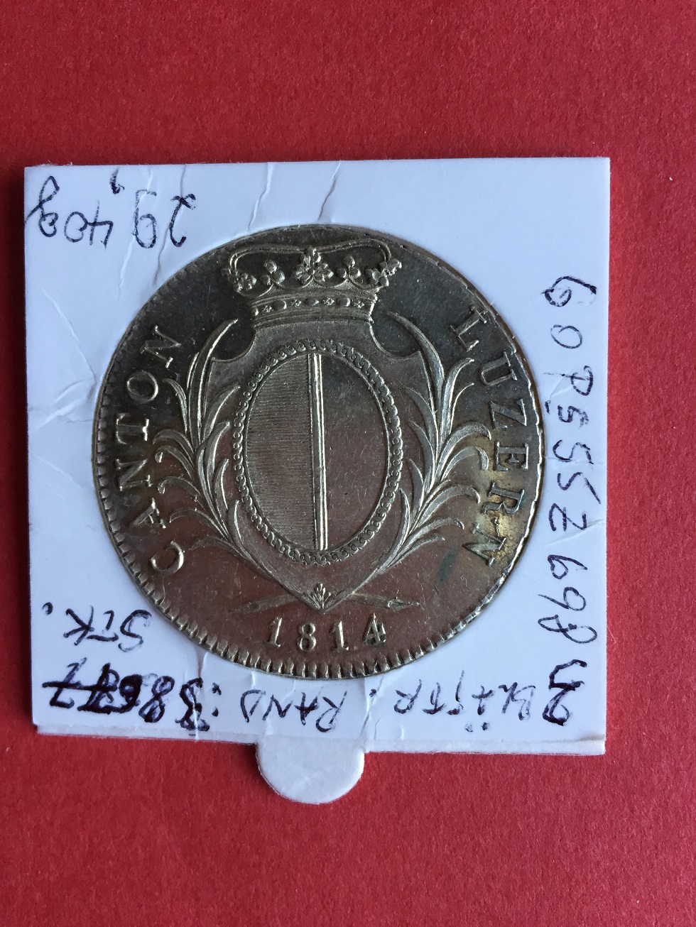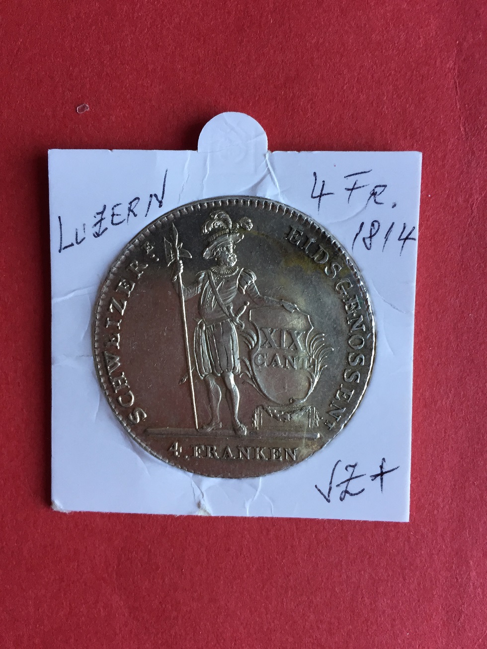 4 Franken 1814, canton Luzern ( Lucerna ), tiraj 38677 buc., KM 109 , luciu batere orig., fara greseala la muchie, XF+, model muchie : 3 frunze,