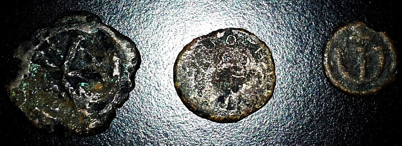 Stanga - dreapta: monede bizantine. Cea din stanga jumatate de follis (K - douazeci de nummia), cea din dreapta pentanummia (epsilon/E - 5 unitati). Perioada: probabil Justinian I - Justin II. De aici puteti cauta pe google mai multe informatii.